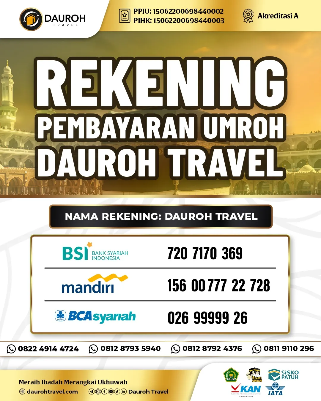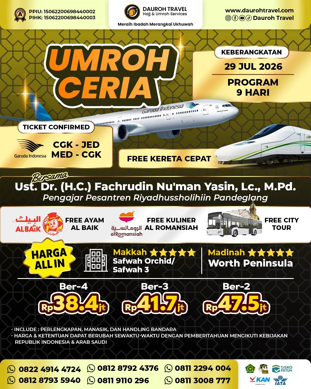 PT Dauroh Travel Indonesia adalah perusahaan perjalanan ibadah berizin resmi yang berpengalaman dalam melayani jamaah Umroh dan Haji Khusus. Dengan komitmen penuh terhadap amanah dan profesionalisme, kami hadir untuk memastikan setiap jamaah dapat menjalankan ibadah dengan tenang, nyaman, dan khusyuk — seluruhnya berlandaskan Al-Qur’an dan Sunnah sebagai pedoman utama kami.